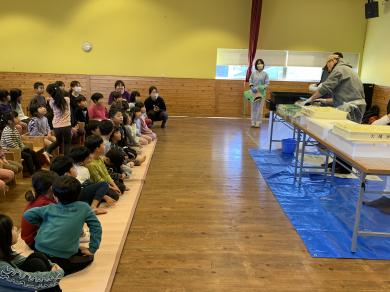 年長 魚の解体ショー 給食に魚を仕入れてもらっている魚屋さんの用意した「鮪」を身の前でさばいてもらい 命を学びいただきました。
